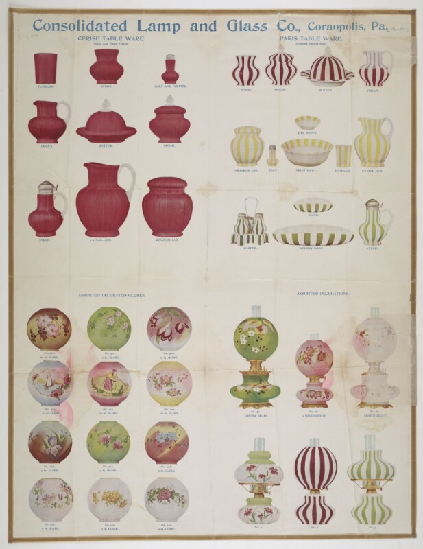 There is an assortment of tableware in this color advertisement for Consolidated Lamp and Glass, Co from a collection at Duke. This advertisement is estimated to be from 1895-1900.