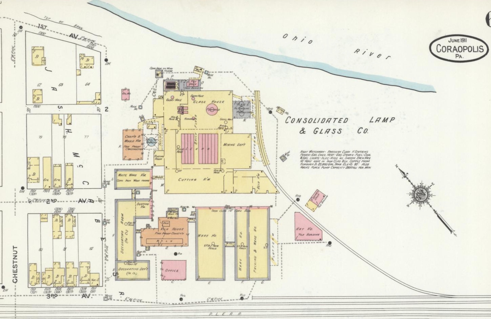 The Consolidated Lamp and Glass Company’s Coraopolis factory as shown in the June 1911 Sanborn Fire Insurance map.